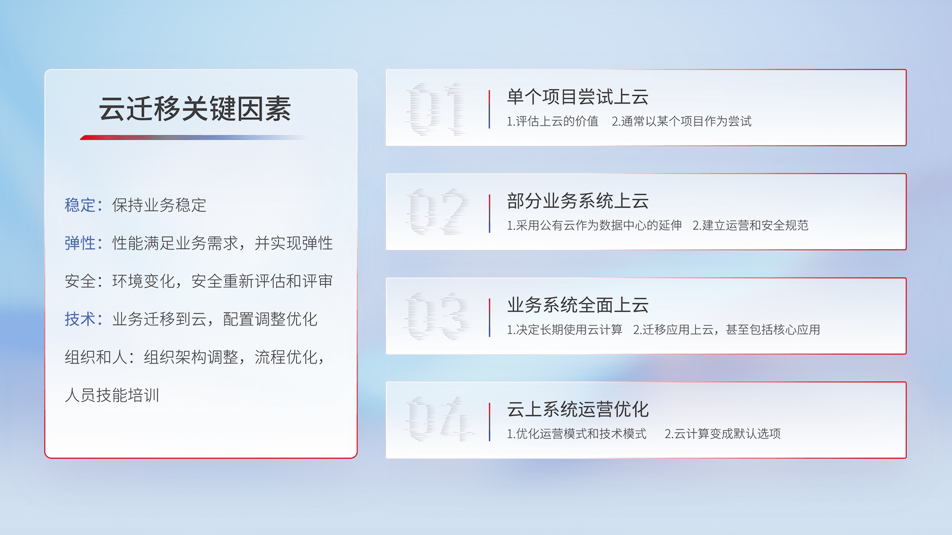 结合实际业务,,,从规划设计、、云平台选型、、、、云原生改造、、、、数据迁移、、、集成交付,,,迁移全过程为客户识别最佳上云路径,,做好风险识别管理,,,设计网络架构、、身份权限、、、、安全审计合规、、操作审计、、、、日志审计、、监控告警策略、、、多站点容灾设计等,,对云上基础设施进行整体规划,,提升IT治理水平,,,以满足弹性、、高可用、、、、高性能的需求。。。