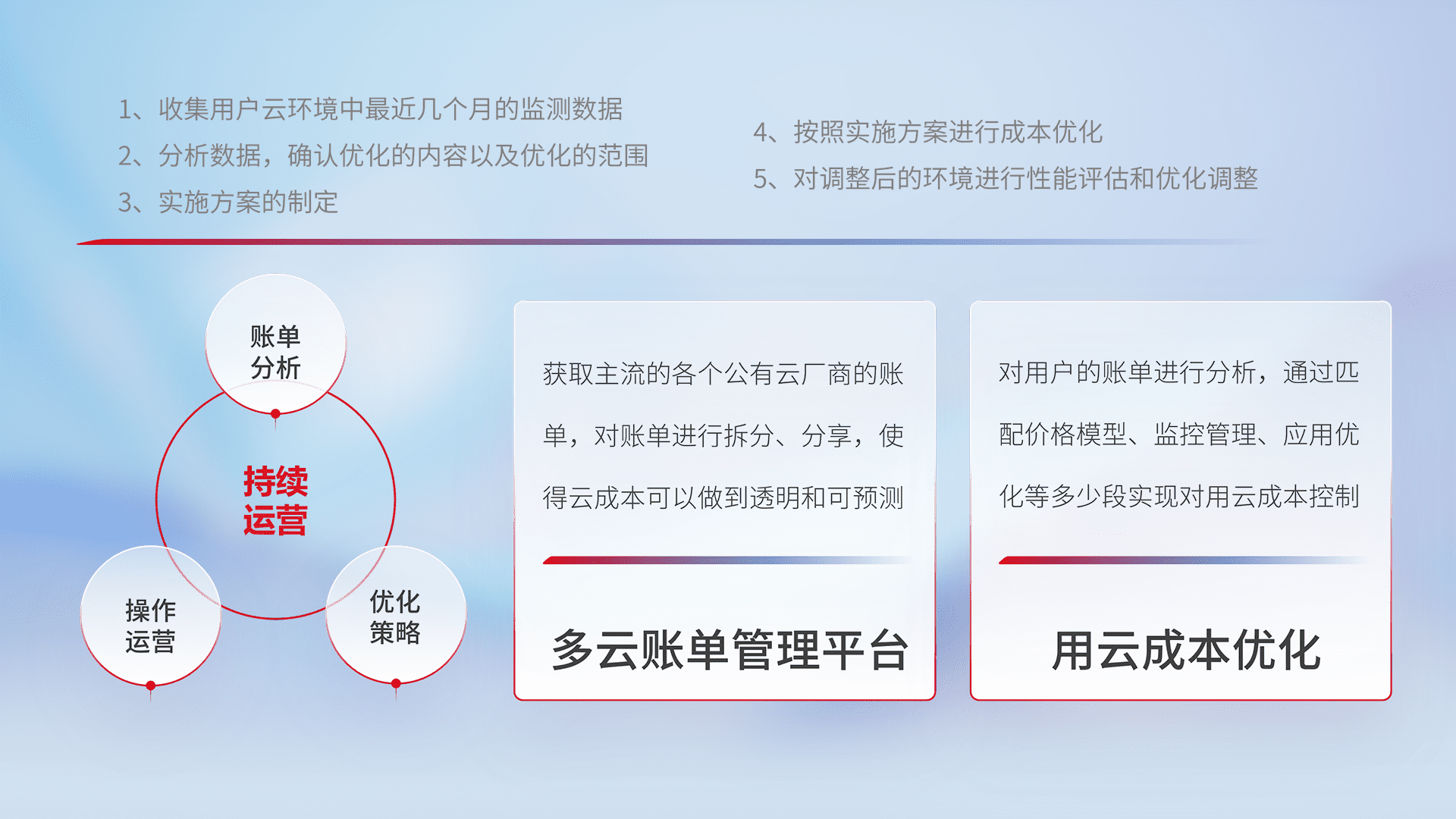 通过多云纳管,,,以统一的资源数据模型把客户的云资源进行抽象和封装,,,,进而实现对多云资源的统一操作,,,,保障云资源管理的可靠性、、稳定性与可用性。。。量身定制化运维内容,,,配置、、、开发运维、、、补丁管理、、、、备份、、监控、、、、认证和访问管理、、、、审计和日常巡检等,,,,保障在用云过程中的可靠度,,,稳定度以及高可用率。。。。